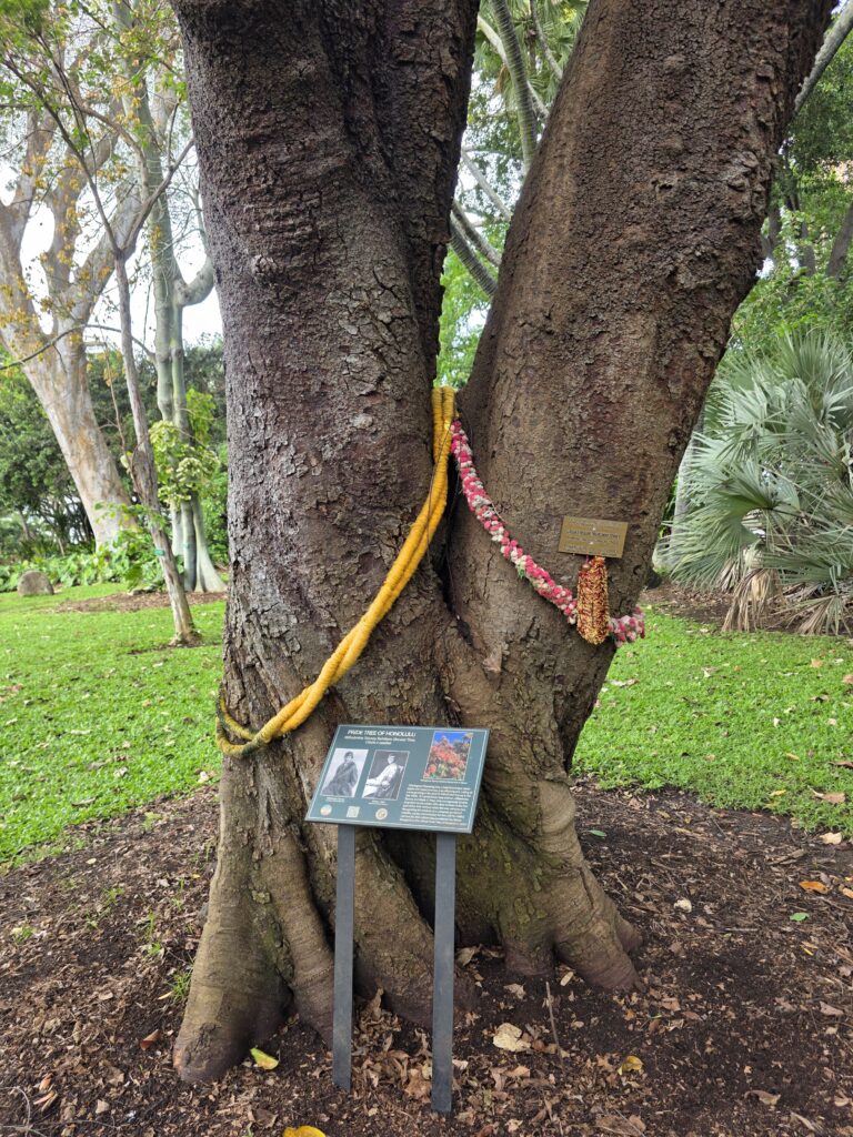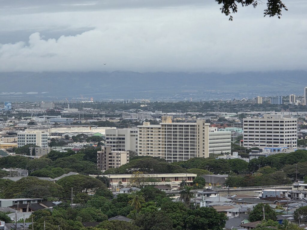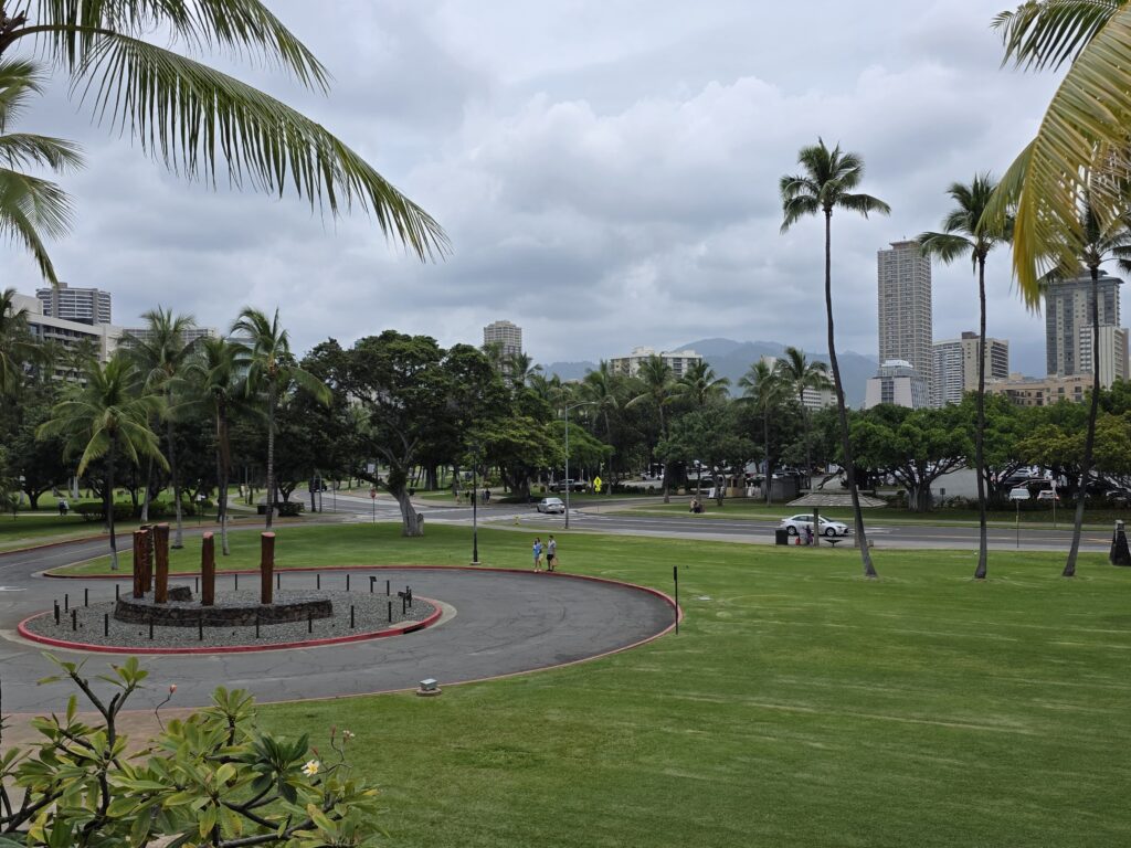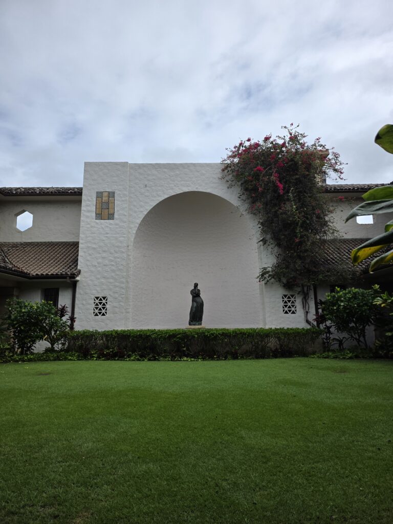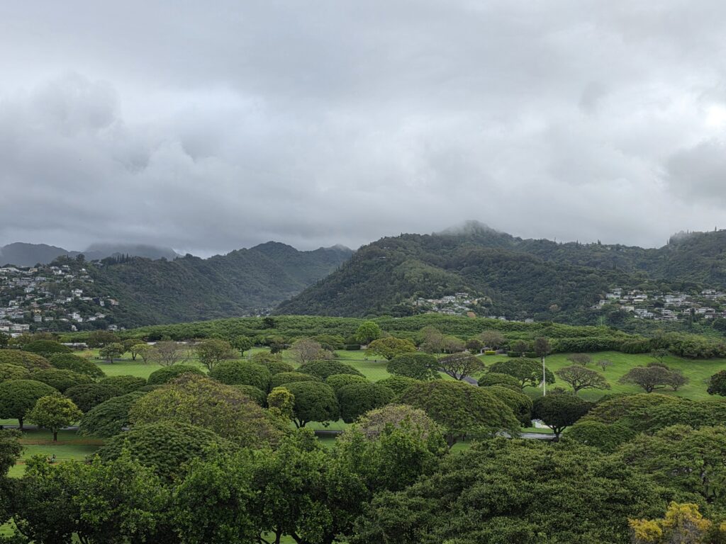 The second week I managed to get out before the rain for my morning walk everyday but Friday. It is unfortunate that Dave has to work until noon because the mornings were ok, as far as rain goes, but it seemed to rain every afternoon. Which I believe is pretty common in Hawaii this time of year, just not this volume of it. On Saint Patrick’s day they had a little parade down Kalākaua Avenue, which is one of the main thoroughfares through Waikiki that runs parallel to the ocean. It was fun to be able to go to Maui Brewing Company watch from the terrace that overlooks the avenue. The next day we took the bus to Foster Botanical Garden which was cool. We only had about an hour to explore and it was fun to learn about some of the trees that you can find in Hawaii. I started to get a little stir crazy by the 19th so I took the bus in the morning to the National Memorial Cemetery of the Pacific at Punchbowl Crater. I had never been and I heard that they have a good view overlooking Honolulu that I wanted to see. I got a little wet, and the view was somewhat obscured by clouds, and I’m still glad I went. I like visiting cemeteries in the cities that we visit and this one was beautiful. After I visited the cemetery it wasn’t raining too hard and I noticed that the Honolulu Museum of Art (HoMA), which I had also been wanting to visit, wasn’t too far of a walk away, so I went and did that. What a cool museum HoMA is. It “houses an encyclopedic collection of over 50,000 pieces, specializing in Asian art, American and European painting, and Pacific, African, and American traditional works. Highlights include significant Japanese woodblock prints, Korean ceramics, Buddhist sculpture, modern and contemporary art, and a vast collection of works on paper and textiles.” The building itself is also structurally beautiful with several different courtyards. If you’re ever in Honolulu I highly recommend a visit to this museum.